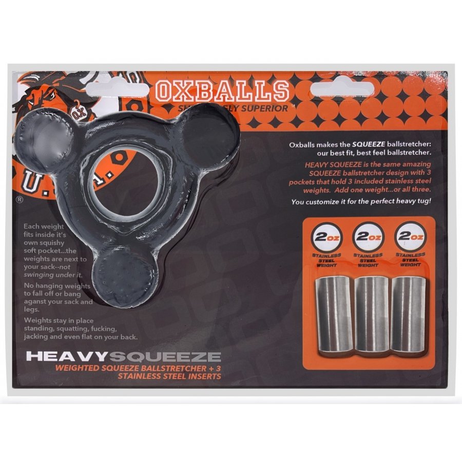 Ce ballstretcher souple avec poids HEAVY SQUEEZE est un sextoy homme proposé sur le sex shop par la marque gay Oxballs. Il est idéal pour étirer les bourses vers le bas et donner plus de sensations.